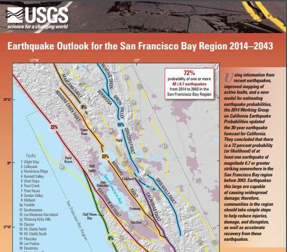 在7月,美国地质调查局(U.S. Geological Survey)蒙洛公园市分局的研究人员便发表了报告,呼吁居民作好震灾应变的准备,这份报告 (http://bit.ly/BayQuakeRpt)说,30年内湾区发生大地震的可能高达72%。