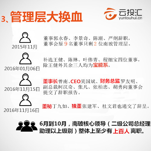 2016年11月15日——南玻A公告称公司董事长曾南、CEO吴国斌、财务总监罗友明、副总裁柯汉奇、副总裁张凡、副总裁张柏忠、副总裁胡勇向董事会提交了辞职报告。