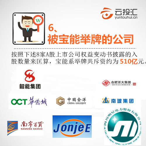 包括万科在内,宝能系通过前海人寿和钜盛华共举牌了8家A股和1家港股上市公司,它们是华侨城A(000069.SZ)、中炬高新(600872.SZ)、韶能股份(000601.SZ)、明星电力(600101.SZ)、南宁百货(600712.SH)、南玻集团(000012.SZ)、合肥百货(000417.SZ)和中国金洋(1282.HK),其中宝能系持股比例超过30%的有中炬高新、韶能股份。按照上述8家A股上市公司权益变动书披露的入股数量以及买入均价来匡算,宝能系举牌共斥资约为510亿元(中国金洋是港股公司并未计算在内)。