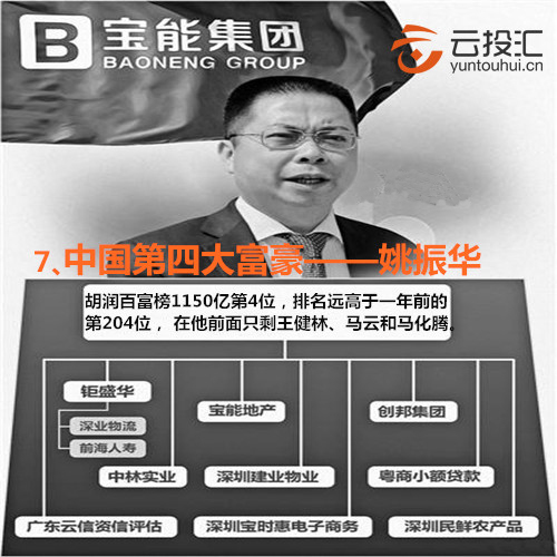 对于宝能系的实际控制人姚振华,资本市场还比较陌生,多年来一直保持着低调和神秘,关于其发家史和出身公开资料目前难以寻觅。胡润研究院发布的《2016胡润百富榜》中,现年45岁的姚振华财富翻增820%到1150亿,跃居第4位,排名远高于一年前的第204位,在他前面的只剩王健林、马云和马化腾。当初的“野蛮人”如今成为不可小觑的“巨人”。