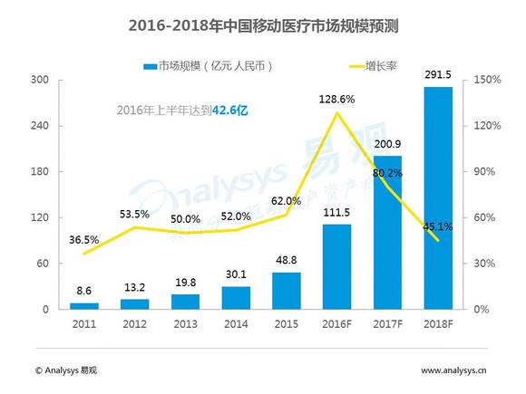 Analysys易观统计显示,移动医疗行业市场规模呈逐年上升趋势,预计2016年全年将达111.5亿元,同比增长128.6%,2016年上半年移动医疗行业市场规模达到42.6亿元,接近去年全年48.8亿,增长态势良好。