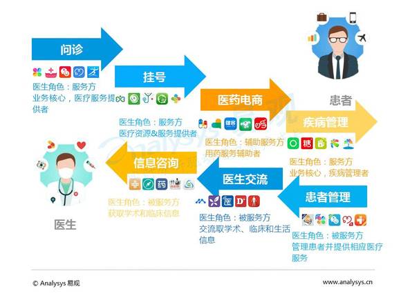 问诊、挂号、医药电商、疾病管理在服务患者的同时也接入医生资源,作为服务提供方。
