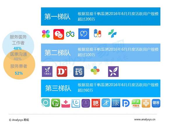 根据易观千帆监测显示,2016年6月移动医疗月度活跃用户规模超过50万的APP共计25个。按照APP服务对象属性分类: