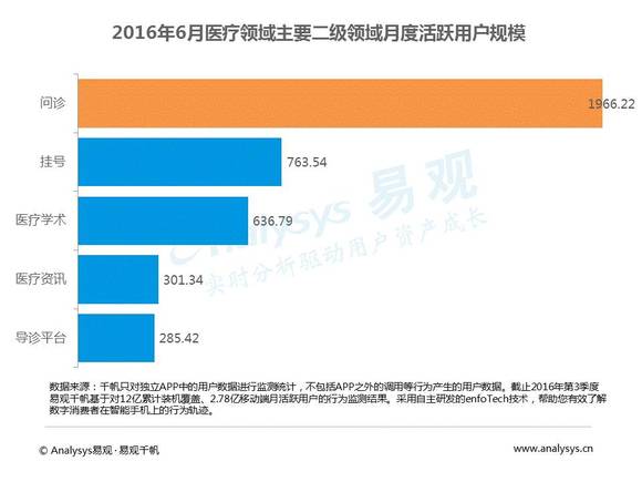 以传播信息为主的医疗资讯和导诊平台渗透率下降呈现负增长,Analysys易观分析认为移动医疗行业更趋于理性,发展重心更加明确。