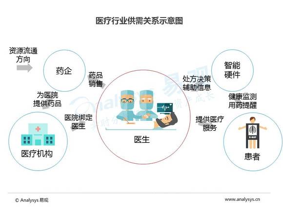 医疗行业主要有医疗机构、医生、药企和智能硬件商等资源提供方,其中医生起到枢纽作用,联接各个角色,行业价值显著。
