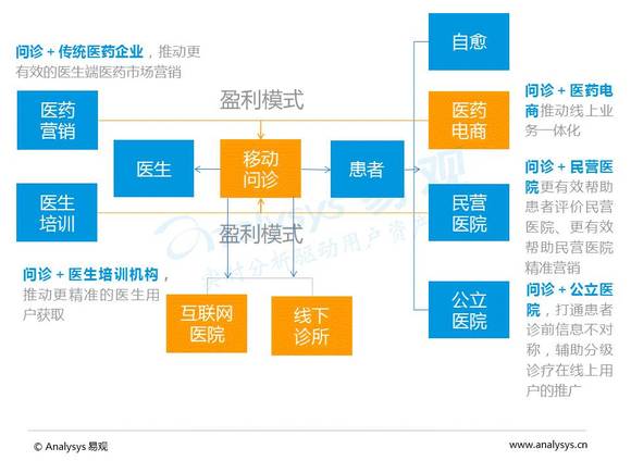 Analysys易观分析认为,作为沟通患者和医生交流的有效院前信息平台移动问诊,正通过其平台的效益与多种传统医疗环节结合,如问诊+医药营销、问诊+医生培训、问诊+民营医院、问诊+公立医院等,推动用户移动医疗使用习惯和与传统医疗行业的多角度融合、共同发展。