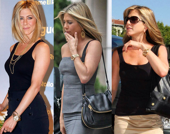 安妮斯顿对劳力士的重视度非常高,这块金劳经常出现在她的不同街拍中,她用金劳搭配黑色肩带休闲造型,或者露肩装,可以露出她迷人的锁骨和脖颈线条,中性优雅充满活力。