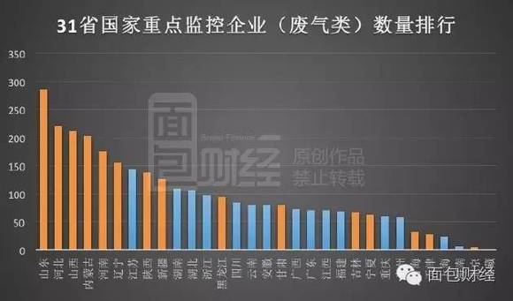 山东以286家国家重点监控企业登顶。以煤炭钢铁著称的山西省,废气重点监控企业也不211家,位居山东河北之后。以下是面包财经根据官方数据整理的各省监控企业排行: