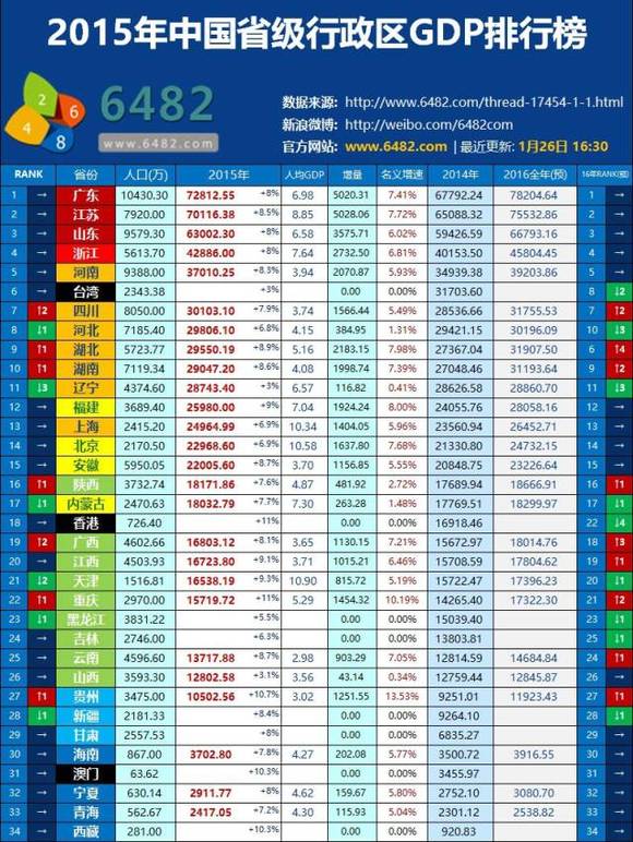 2015年,贵州省GDP录得10502.56亿元,比上年增长10.7%,经济增速位居全国第3位。贵州经济增速已连续5年居全国前3位,但经济总量仍在全国排名靠后。