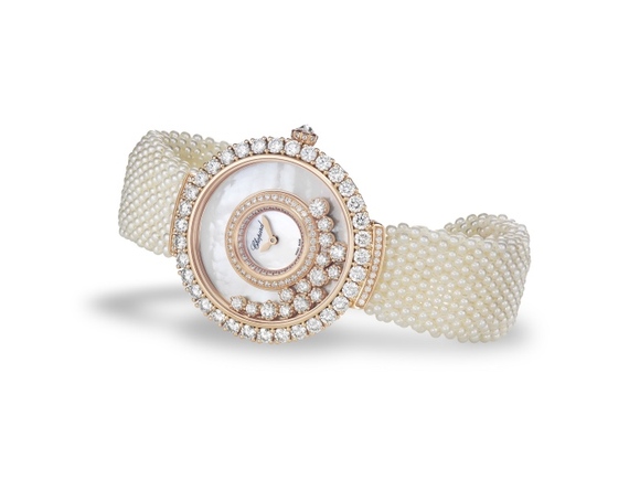 萧邦为欢乐之舞40周年纪念推出的这款珠宝腕表,所有灵动的宝石采用全新爪镶法镶饰,可以在表盘上随意滑动,并搭配了精致的白色珍珠表带。像极了雪白高贵的海德薇,乖巧地低下头接受主人的爱抚,还会瞪着大眼睛一副惊慌失措的呆萌。