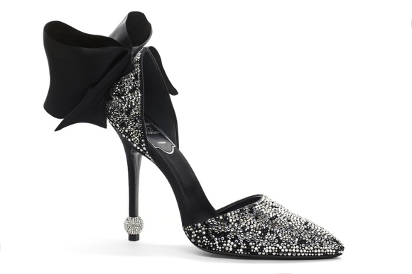 黑缎鞋面满缀星星点点的水晶,如繁星眨眼的夜空,璀璨神秘。细致钻饰与经典球型跟呼应,散发温柔气质,恰似一个不愿醒来的缱绻梦境。2016多伦多电影节上,范冰冰身着经典小黑裙搭配这双黑水晶蝴蝶结球型高跟鞋,明艳优雅。