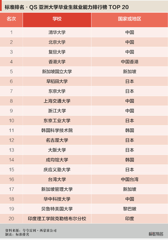 在亚洲地区,中国内地高校包揽三甲,两所旗舰高校清华大学和北京大学分别排在前两位,复旦大学位居第三,中国香港地区的香港大学和新加坡国立大学进入前五。日本的早稻田大学、东京大学、东京工业大学和中国内地的上海交通大学和浙江大学进入前十。华中科技大学排在第18位。