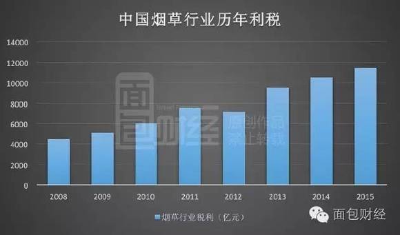 根据公开的报道,2015年中国军费开支约9000亿。烟草行业利税已经多年超过军费开支。下图为面包财经根据公开数据绘制的中国烟草行业历年利税: