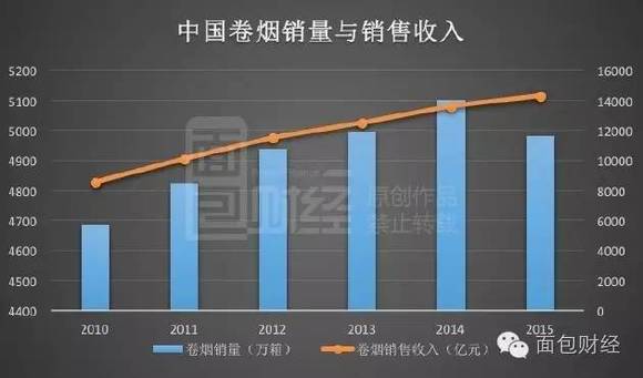 据国家烟草总局数据:2015年中国卷烟的销量为4979万箱,同比下跌2.36%;这是多年以来,中国卷烟销量首次下跌。但卷烟销售收入并未随销量下滑而下跌,反而增加了632.7亿元,达到1.42万亿,创下历史新高。