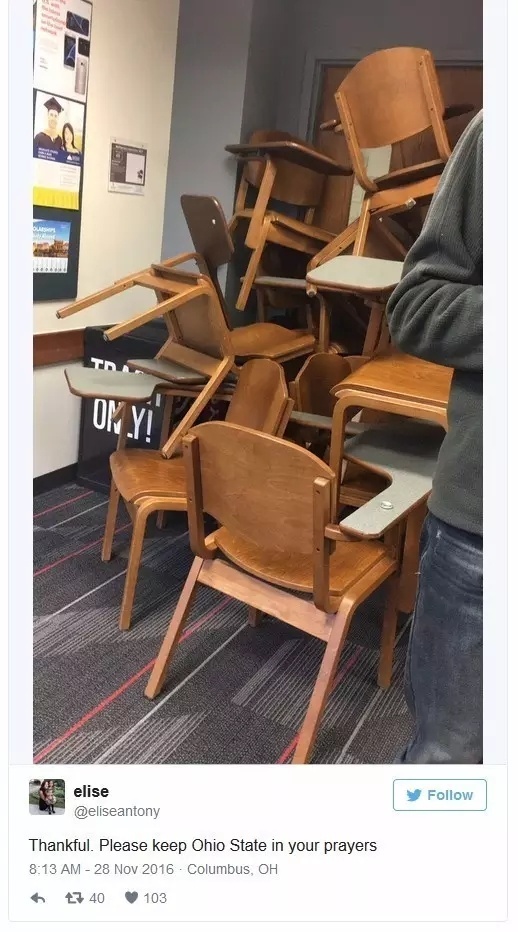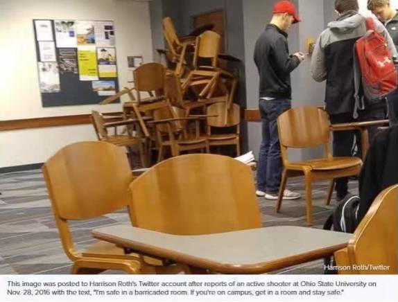 一位名叫Harrison Roth学生在Twitter上发布了他们用桌椅堵门的照片,并说:“我在封好的屋子里很安全。如果你在校园里,请快找地方躲避保证人身安全。”