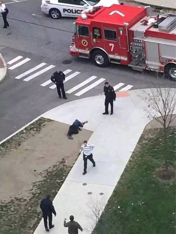 不久之后,犯罪嫌疑人被击毙(有学生拍摄到警察在路边处理疑犯尸体的照片见下图)。嫌犯身份根据NBC报道,是18岁的学生Abdul Artan, 索马里难民,今年8月转学进入俄亥俄州立大学。目前警报已经解除,据传现有两名嫌犯被捕,警方仍在调查其他嫌疑人,而校方取消了今天所有的课程。
