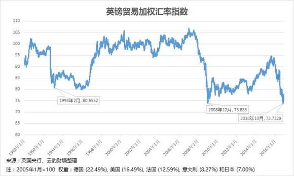最新一次是席卷全球市场的“退欧风暴”。“退欧”黑天鹅飞出之后,按贸易加权衡量的英镑汇率收跌上月一度至168年新低73.73,跌穿2008年金融危机、1992年英国退出欧洲汇率机制和1931年退出金本位制等任何一次危机时的低点。