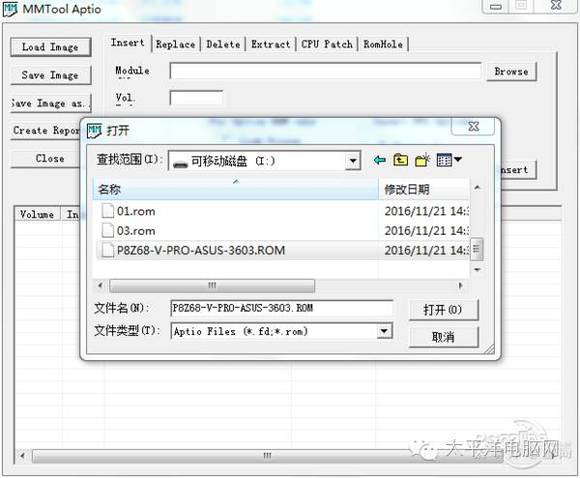 1、运行MMTool,点击左上角的Load Image来打开你准备好的BIOS文件,默认文件类型扩展名为.fd和.rom,选择完之后点击Open打开。