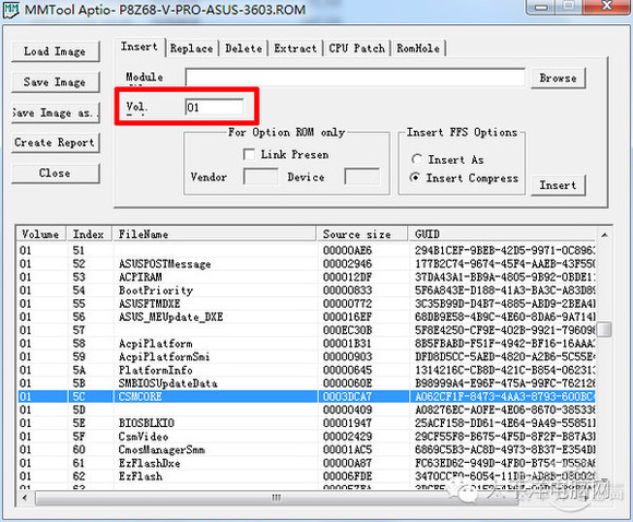 2、打开后你会发现有一堆的模块及信息,拉动右边的滚动条,找到CSMCORE这一项并左键单击,单击后你会发现CSMCORE对应的Volume序号被自动填到上面的Vol.Index中,我这里为01。