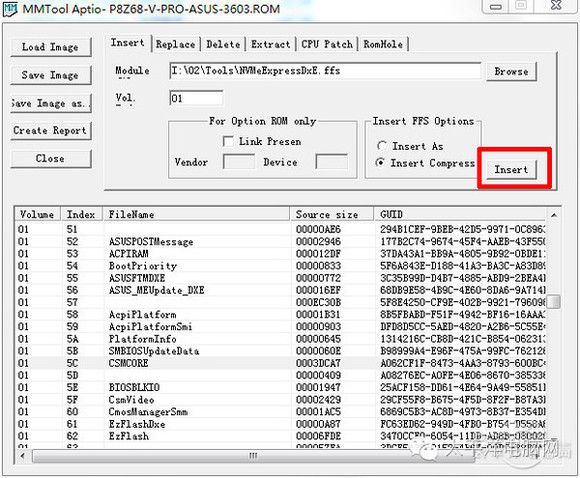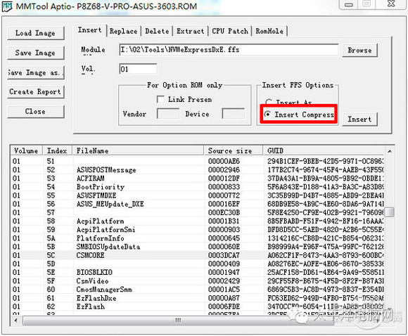 4、将Insert FFS Options改为Insert Compressed,再次确认Vol.Index里的序号正确,且For Option Rom only下的Link Present选项没有打勾。