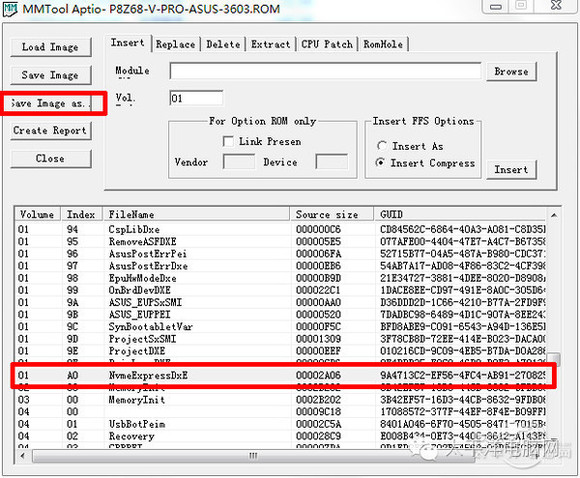 6、检查确认下,若操作无误,拉动右边的滚动条,现在CSMCORE对应的Volume序号的最后一个模块应该就是刚才插入的NVMeExpressDxE了,最后别忘了点击左上角第二个Save Image来保存修改。