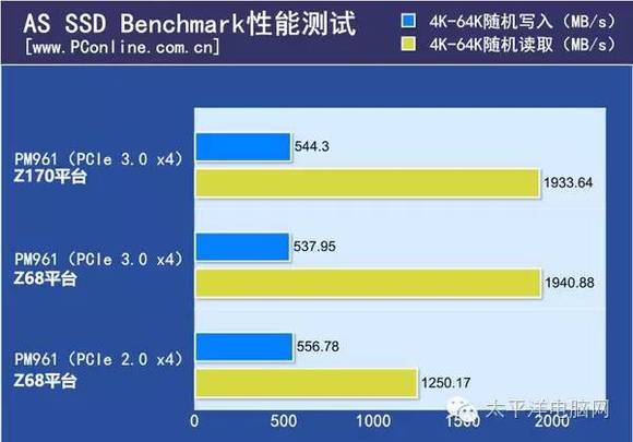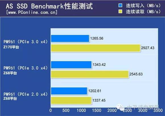 评测小结:在Z68主板上使用转接卡走PCIe 3.0通道和没有使用转接卡直接插Z170主板上的M.2接口,PM961读写速度发挥基本同一水平,仅在连续读写这一项中掉了队,有可能是Z170平台里新CPU和DDR4等新硬件的整体性能所带来的优势;反过来看在Z68主板上使用转接卡走PCIe 2.0通道的PM961性能则受到一定的限制,没有发挥出应有的性能,主要是读取方面;但整体读写都能突破500MB/s,超过传统的SATA SSD。