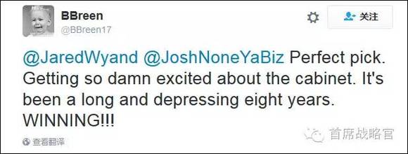 @BBren :“完美的人选,这届内阁太让人惊喜了。过去真是漫长的、令人沮丧的8年。胜利!!!”