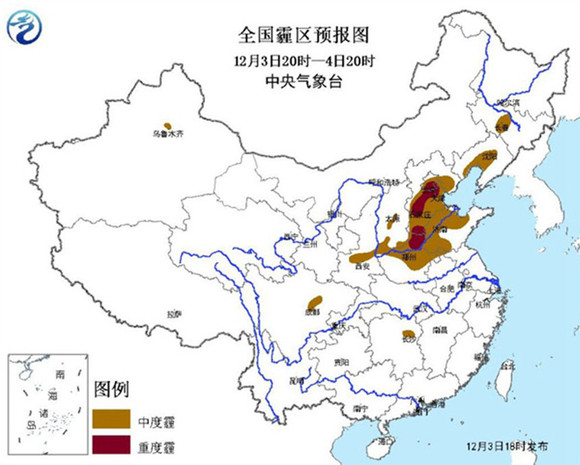 预计,3日20时至4日20时,北京中南部、天津、河北中南部、山东中西部、河南北部、山西中南部、陕西关中、辽宁中南部等地的部分地区有中度霾,其中,北京南部、河北中南部、山东西部、河南北部等地的部分地区有重度霾,河北中南部局部地区PM2.5峰值浓度可达400至450微克每立方米,最低能见度不足500米。