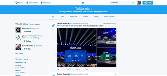 在这场年终总结中,Twitter虽然并未向界面透露中国在公司整体广告业务上的占比,但中华区商务总监Alan Lan表示:“中国已经是Twitter广告业务增长最快的地区”。
